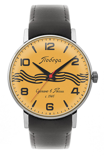 Часы «Победа 2014» оформлены в цветах, символизирующих праздник, – желтом и черном, также на них изображена георгиевская лента. Эту линию создатели посвятили ветеранам войны.