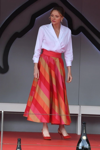 Для этого события королевская особа выбрала утонченный летний образ. Она сочетала белоснежную блузку на запах с полосатой юбкой, созданной дизайнером Сарой Рока. Вещи, как сообщается, вместе стоят около 1300 долларов (читайте также: Было время: 5 самых дерзких и запоминающихся образов княгини Шарлен).