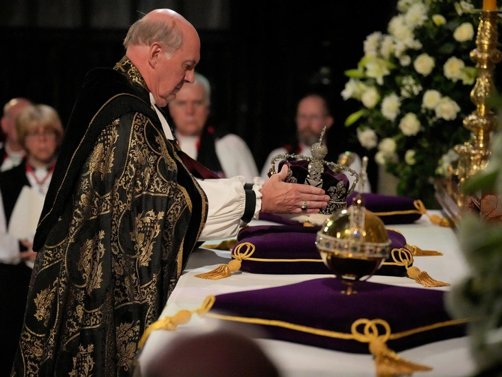 В часовне Святого Георгия держава, скипетр и корона были убраны на фиолетовые подушки, знаменуя финал правления покойной королевы. Преподобный Дэвид Коннер возложил их на главный алтарь, и перед тем, как был спет последний гимн, все они были удалены ювелиром короны и вместе с капитаном и сержантом по оружию переданы настоятелю. Размещение их на алтаре имеет большое значение, потому что в 1953 году корона была снята с алтаря Вестминстерского аббатства и возложена на голову королевы, положив начало ее правлению.