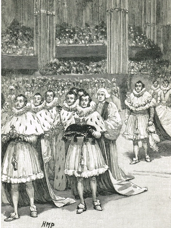 После благословения король взошел на свой трон и «вознесен на него архиепископами, епископами и другими пэрами королевства».