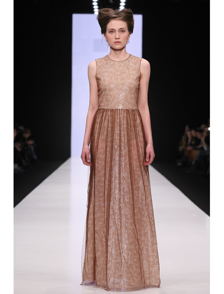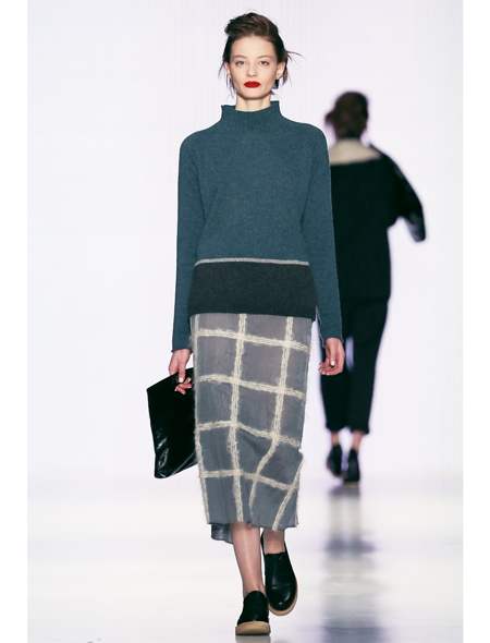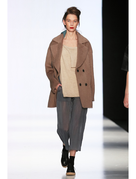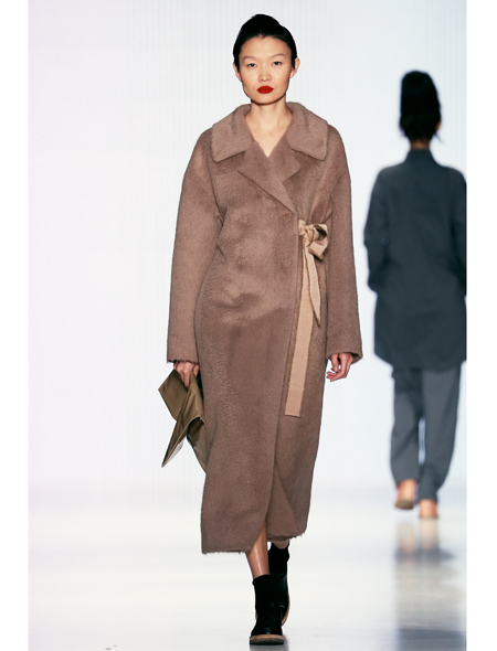 Дизайнер Y U L I A NIKOLAEVA, напротив, играла на полутонах и сочетаниях. В ее арсенале были и мохеровый ворс, и лакированная кожа, и шелковый струящийся шифон – комплектам была присуща многомерность и продуманность.