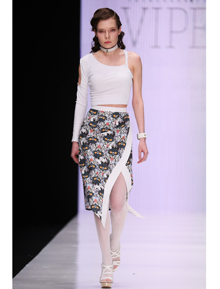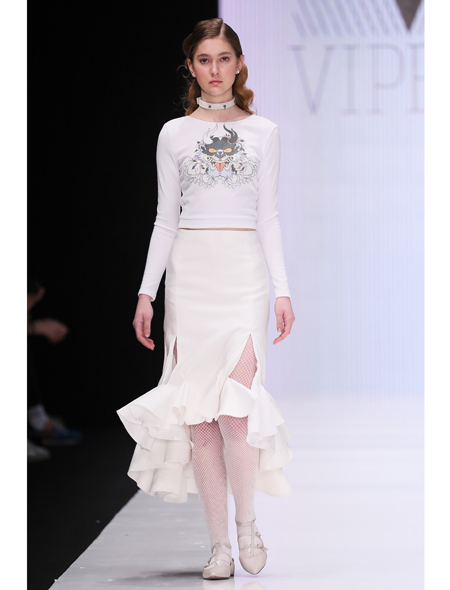 В тот же день у гостей MBFW Russia была возможность увидеть сразу несколько дебютов. Победитель конкурса начинающих дизайнеров DHL Анастасия Ильина представила свою коллекцию в восточном стиле. Другой один дебютант на Неделе моды – молодой бренд VIPERS сестер Кати и Веры Вайпер. Кстати, специально для этой коллекции был разработан принт, концептуально связанный с названием бренда – голова змея на фоне лотоса.