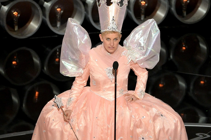 Организаторы «Оскара» подумали, что из Эллен Дедженерес получится великолепная ведущая вечера, и не прогадали: она не только иронизирует над известными людьми, но и умеет посмеяться над собой. Одно время она вела церемонию в пышном розовом платье принцессы с огромными воланами на плечах и в высокой короне.