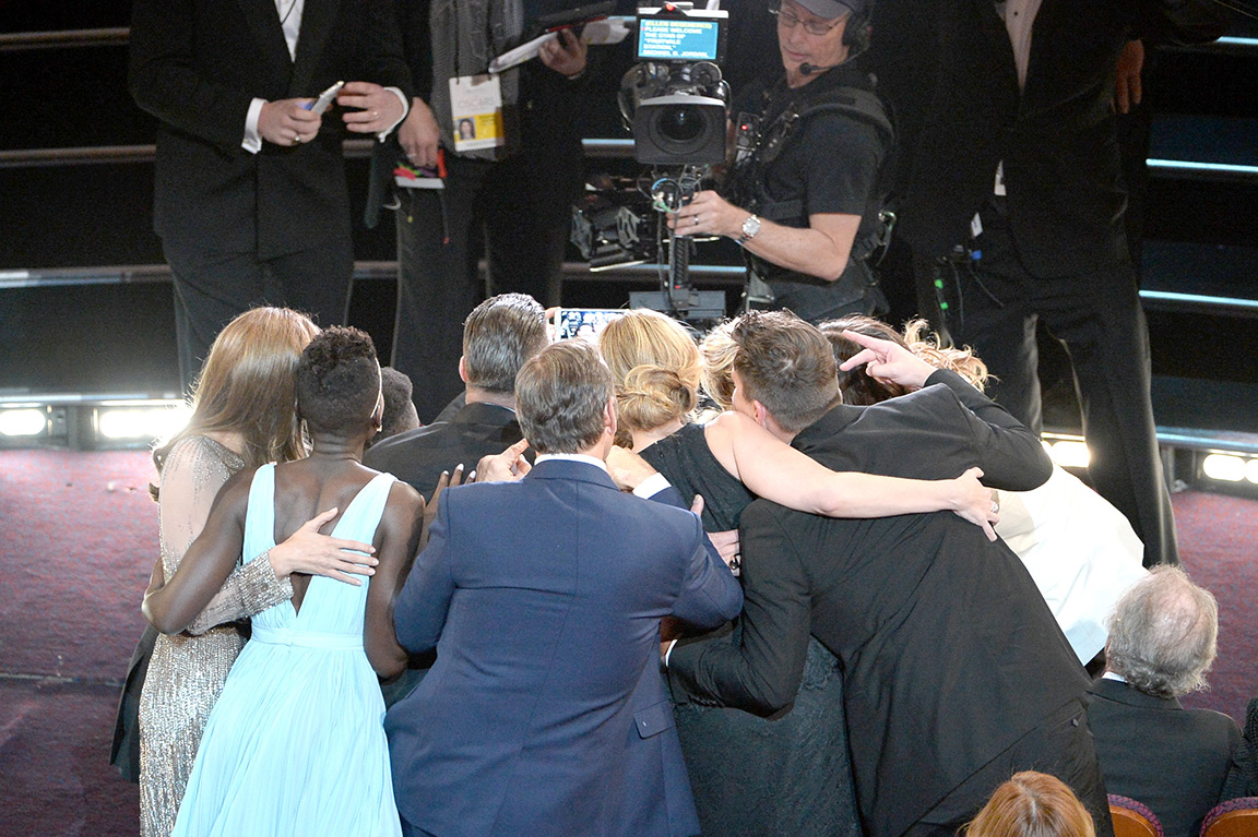 Из веселого – одним из главных ньюсмейкеров стала ведущая церемонии Эллен Дедженерес (Ellen DeGeneres), которая накормила всех номинантов пиццей и сделала с ними совместную selfie. На фотографии присутствуют Дженнифер Лоуренс, Джулия Робертс, Мерил Стрип, Кевин Спейси, Брэд Питт, Анджелина Джоли и Брэдли Купер, который держит камеру. Ведущая подписала снимок: «Если бы только рука Брэдли была длиннее. Лучшее фото когда-либо». За час этот снимок набрал более 1,8 млн ретвитов, побив рекорд самой популярной до этого фотографии с Бараком Обамой, которая была сделана после того, как он победил на выборах.