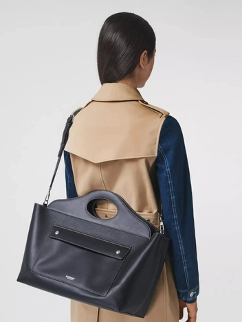 Новая фирменная структурированная сумка-тоут от Burberry, разработанная главным креативным директором Риккардо Тиши. В основе — оригинальный дизайн с добавлением переднего кармана и кожаной тесьмы. Сумка из итальянской кожи отделана контрастной строчкой, края сумки окрашены вручную. Новые варианты сумки представлены в черном, белом и бежевом цветах.