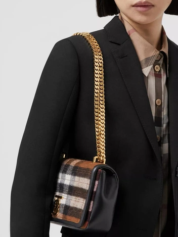 Сумка доступна в маленьком и среднем размерах. Благодаря регулируемому ремешку-цепочке с уникальным бриллиантовым эффектом, ее можно носить на одном плече, перекидывать через шею или использовать как клатч. Простеганная кожа повторяет культовую клетку Burberry.