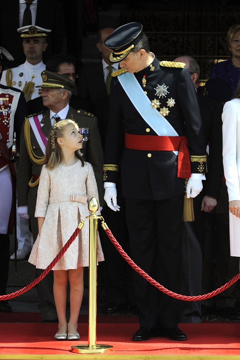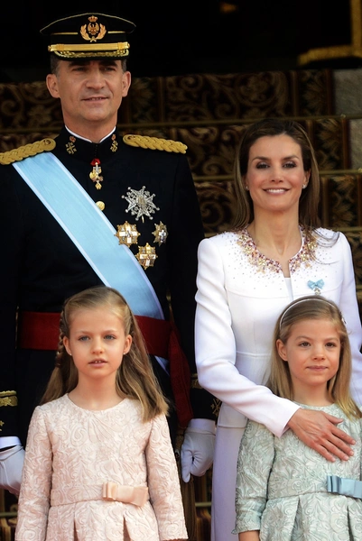 Сама церемония проходила во дворце Кортесов в Мадриде. Немного ранее в резиденции монархов в Сарсуэле бывший король передал нынешнему пояс капитан-генерала и лично повязал его. Этого звания удостаивается главнокомандующий и по совместительству король страны. Затем новоиспеченный правитель Филипп VI в сопровождении жены и дочерей отправился на королевском Rolls-Royce Phantom IV во дворец Кортесов на церемонию коронации. Сам монарх надел военную парадную форму, королева Летисия выбрала платье и пальто ему в тон одного из своих любимых дизайнеров Felipe Varela. Инфанты София и Леонор были одеты в одинаковые платья пастельных тонов – розового и голубого.