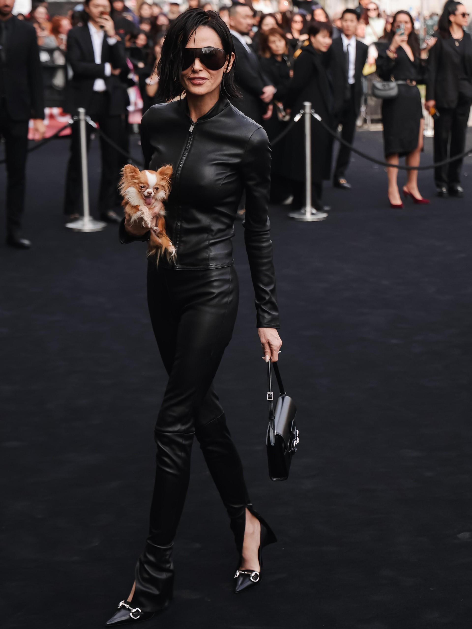Для показа Демны она решила показать совершенно другую себя. Деми выбрала кожаный облегающий силуэт, надев черную кожаную куртку и узкие брюки в тон, дополнив свой тотал-блэк классической черной сумкой и солнцезащитными очками-щитками.