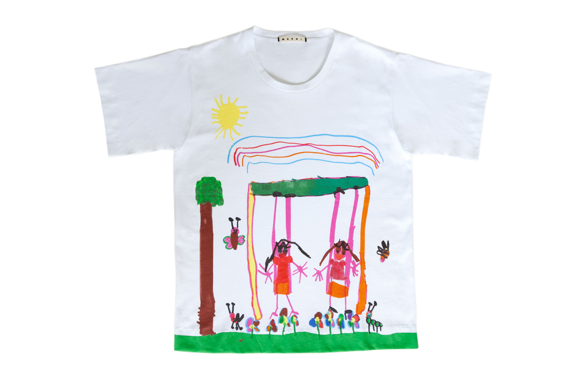 Итальянский бренд Marni выпустил серию футболок в сотрудничестве с детьми, живущими в бедных общинах Боготы, Найроби, Токио и итальянской колонии Финале-Эмилия (Finale Emilia). Линия называется «Детский мир фантазий» (Children’s imaginary world), в ней ребятам предложили нарисовать свои истории по теме «Природа в моей стране», которые стали принтами. Футболки получились яркими: на одной из них изображено поле подсолнухов, на другой – лев, окруженный красными точками, а третья – с двумя девочками на качелях. Прибыль от продажи направлена на помощь школам, больницам и ассоциациям, поощряющим обучение и развитие детского творчества.