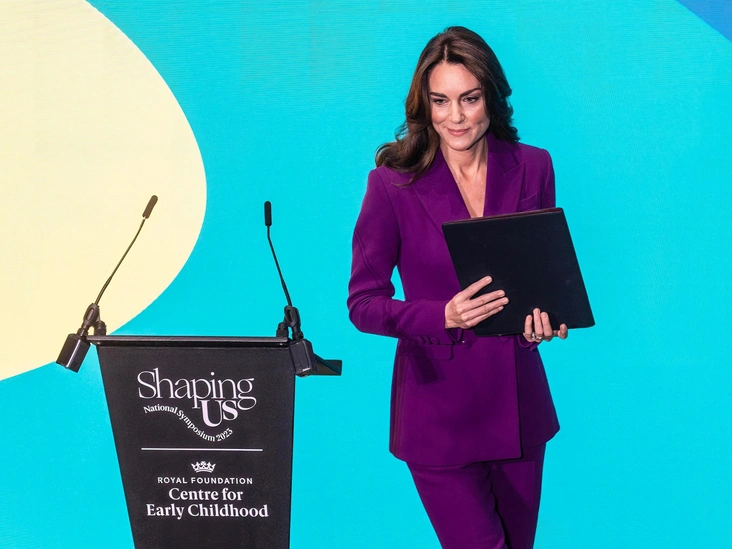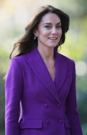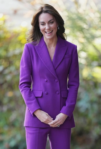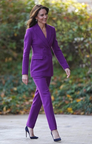 Так, Кейт появилась на симпозиуме в необычном для себя фиолетовом цвете. На принцессе был костюм от Emilia Wickstead с двубортным пиджаком и прямыми брюками, синие замшевые лодочки, а также серьги с сапфирами и бриллиантами в комплект к кольцу леди Дианы. Кэтрин слегка уложила локоны от лица — как отмечают эксперты по стилю, это прическа с омолаживающим эффектом. Как и цвет костюма — яркий оттенок фиолетового молодит принцессу.