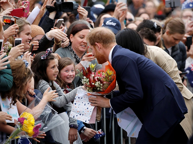 Сегодня в Мельбурне Гарри и Меган первым делом встретила собравшаяся с утра пораньше (да еще и в будний день!) толпа местных жителей, с которой герцог и герцогиня традиционно очень тепло пообщались по дороге к резиденции губернатора Виктории, где королевских гостей уже ждал веселый прием. Местные онлайн-медиа уже пишут, что многим детям родители разрешили пропустить занятия в школе, дабы те смогли попасть на встречу жителей с королевскими гостями.