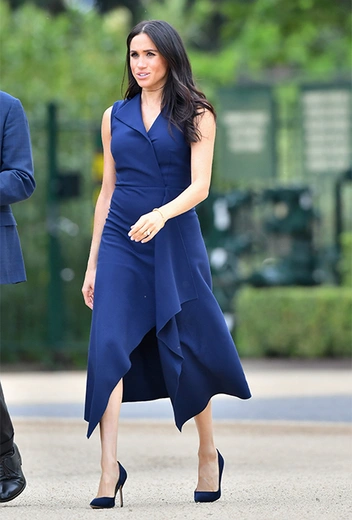 Герцогиня Сассекская вновь доказывает, что хорошо усвоила уроки модной дипломатии: на Меган снова платье австралийского бренда Dion Lee, причем, кастомизированное под нее, что означает, что наряд готовился заранее. Отметим, что насыщенные теплый синий очень идет герцогине, а фасон почти скрывает «положение» Сасекской. В дополнение к платью Меган подобрала сумку Gucci и замшевые классические туфли в тон. С утра в весеннем Мельбурне было прохладно, так что, поверх платья Меган надела тренч Martin Grant, который мы уже видели на ней во время прогулки по Сиднею в минувший вторник.