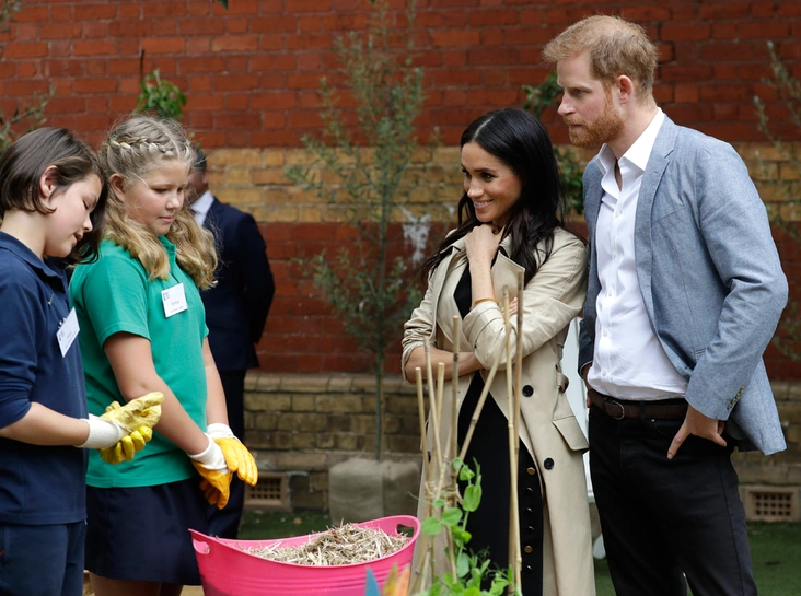 Ближе к полудню герцог и герцогиня также посетили одну из школ Мельбурна, ученики которой вовлечены в программы устойчивого развития. Для визита Гарри и Меган, к слову, сумели оперативно переодеться. Герцог сменил темно-синий костюм на более расслабленный и светлый вариант, а его невеста подобрала черное платье Club Monaco и переобулась в балетки Rothy's. Это, к слову, уже второй раз за неделю, когда супруга принца выбирает обувь на плоском ходу: ранее Ее Высочество уже снимала шпильки ради морской прогулки в Сиднее 16 октября.