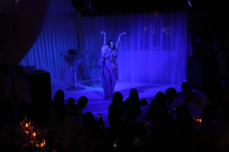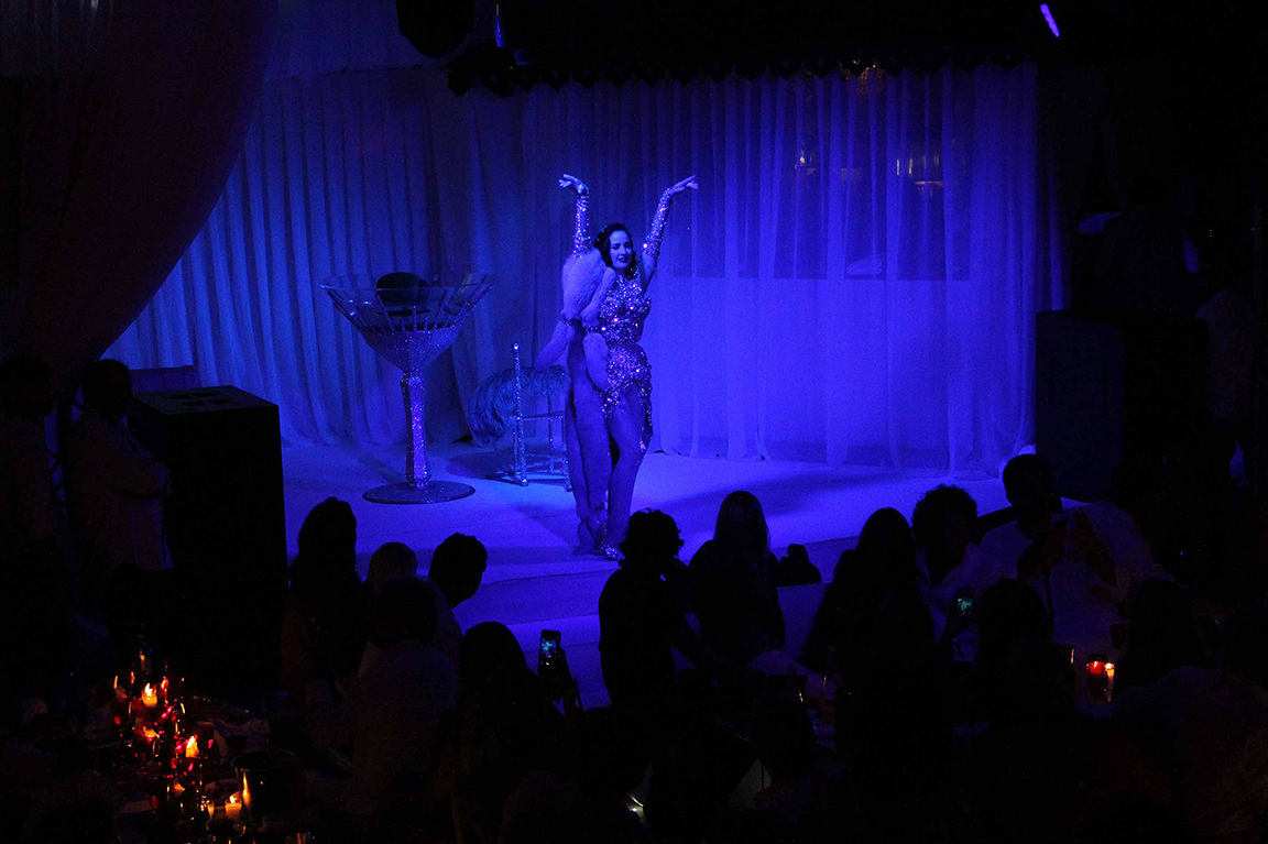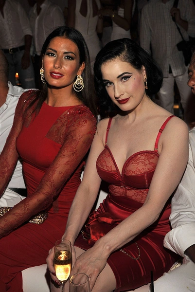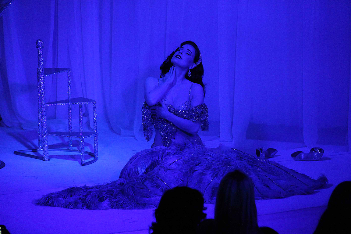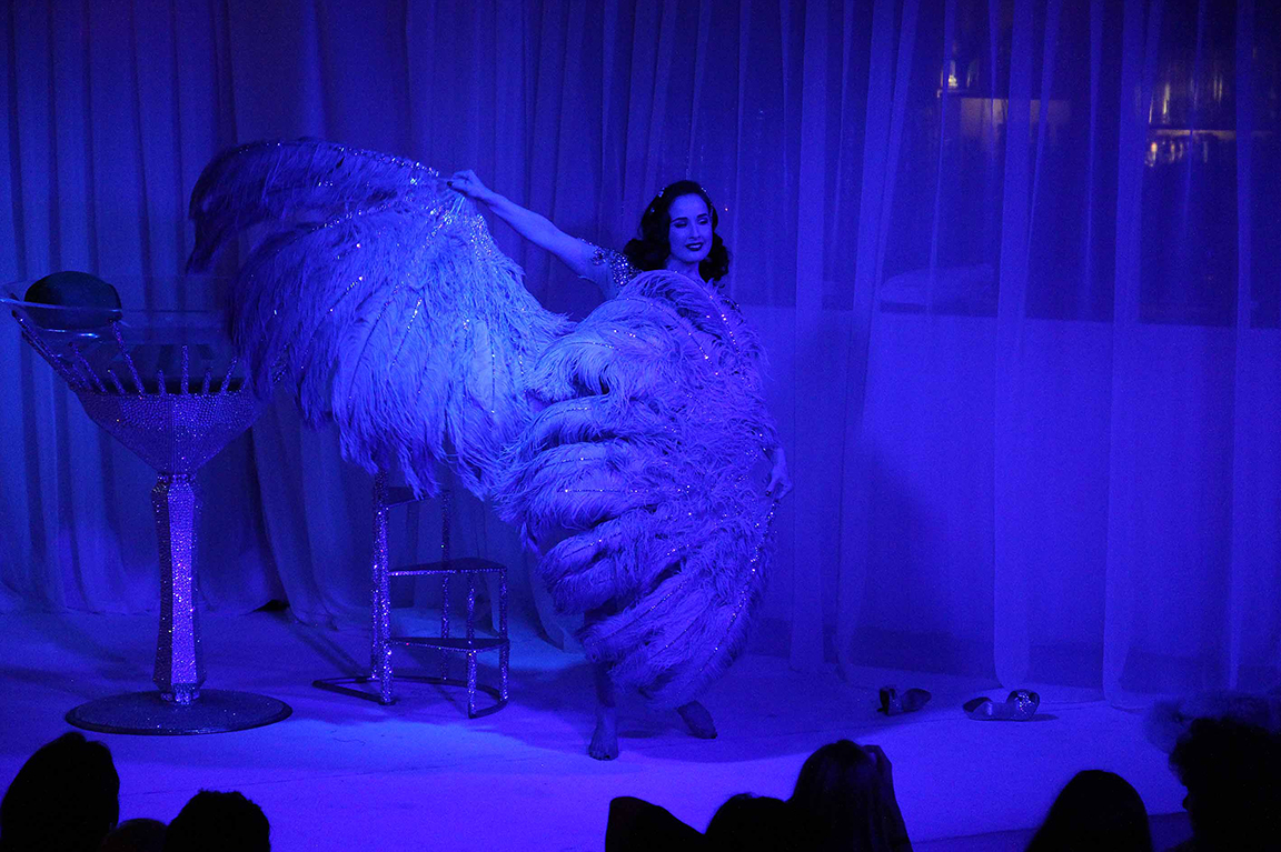 Одним из главных событий громкой вечеринки стало выступление королевы бурлеска Диты фон Тиз, которая также является музой дизайнера. Она исполнила свой эротический номер в бокале для мартини размером с человеческий рост.