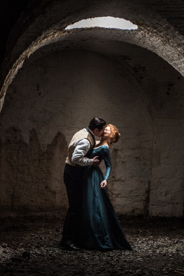 На первых кадрах можно увидеть Джессику Честейн, чьи рыжие волосы прекрасно гармонируют с голубым платьем. На одном из снимков преступники отцовского запрета страстно целуются в сыром подвале, а на втором стоят друг напротив друга и объясняются в чувствах, что позже приведет к трагедии. По сюжету именно героиня Джессики Честейн начинает соблазнять слугу, стараясь сбежать от своей строгой социальной жизни. Их роман начинался как игра за власть в паре, а перерос в запрещенные сексуальные отношения.