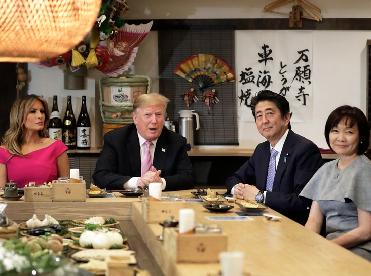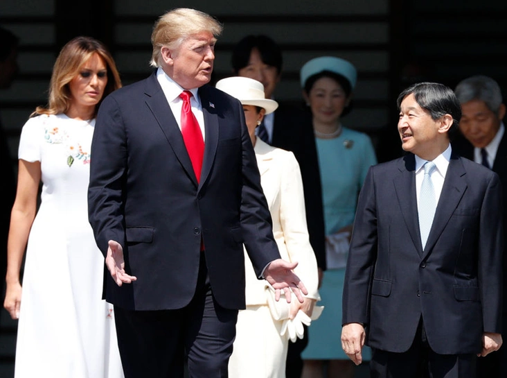 Официальный визит президентской четы США начался с теплого приветствия и обмена рукопожатиями у главного входа во дворец. Трамп поздравил императора с восшествием на престол, Мелания Трамп обменялась вежливыми фразами с императрицей. Нарухито и его супруга в свое время учились в Оксфорде, так что в первые минуты встречи они поговорили с четой Трампов на английском, а через несколько минут в более официальной обстановке императорская пара общалась с президентом и первой леди США на японском языке с помощью переводчиков.