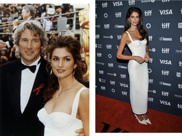 Через несколько лет Кайя вновь повторила этот трюк. В 2024-м она позировала на красной дорожке Международного кинофестиваля в Торонто в белом бандажном платье Hervé Leger — точно таком, как было на Синди во время премии «Оскар» 1993 года.