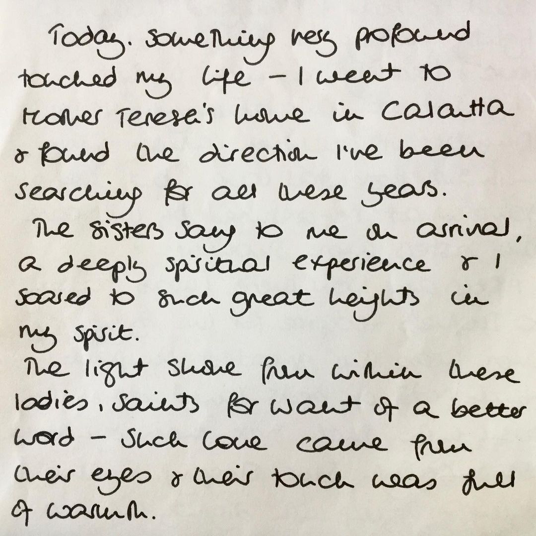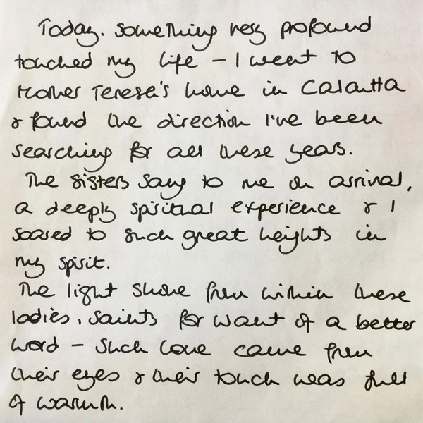 Речь идет об визите Дианы в дом матери Терезы в Индии, который принцесса посетила в 1992 году. Принцесса подробно описала свои эмоции и ощущения: «Сегодня что-то очень глубокое затронуло мою жизнь. Я посетила дом матери Терезы в Калькутте и нашла направление, которое искала все эти годы. Сестры пели мне, когда я приехала, это был глубокий духовный опыт, и моя душа взлетела до небывалых высот. Эти женщины светились изнутри, святые — лучшего слова не найти, их глаза светились такой любовью, и их прикосновения были полны тепла».