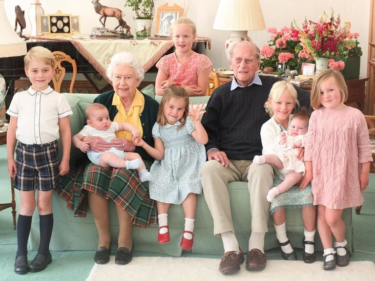 Ну а в среду в Instagram-аккаунте (запрещенная в России экстремистская организация) Кенсингтонского дворца появилось еще два снимка принца Филиппа и Елизаветы с правнуками, ранее неизвестных широкой публике. На одном из них королевская пара сидит на диване в окружении семерых правнуков: принца Джорджа, одетого в клетчатые шорты, маленького Луи на коленях у Ее Величества, принцессы Шарлотты, Саванны и Айлы Филлипс в цветочных платьях, а также Мии Тиндолл и ее крошечной сестры Лены.
