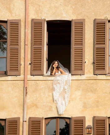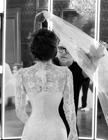 Невеста блистала в кастомном платье Dolce & Gabbana — кружевное платье силуэта 'русалка' было вдохновлено образом Софии Лорен в фильме 'Плавучий дом': высокая горловина, изящно подчеркнутая 180 шелковыми пуговицами, обтянутыми шифоном, и воздушная фата из тюля.