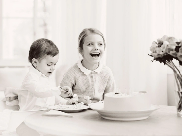 На снимках, сделанных фотографом Эрикой Гердермарк, будущая королева Швеции запечатлена с именинным тортом (с малиновым йогуртом, ванильным кремом и ягодами малины) в компании своего младшего брата, принца Оскара. Съемки проводились в королевском поместье Хага, расположенном недалеко от Стокгольма.