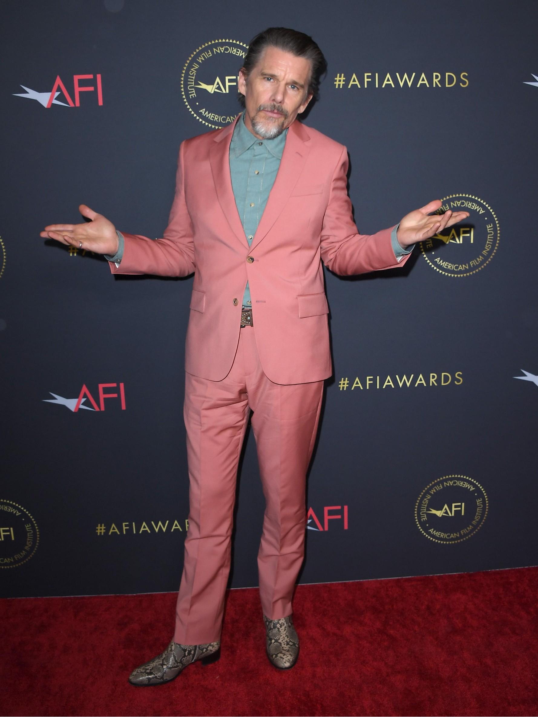 Звезда «Франкенштейна» Мия Гот появилась в тотал-блэк образе — платье из коллекции Calvin Klein, бандана и солнцезащитные очки. Ее коллега по фильму Джейкоб Элорди выбрал светлый костюм от Bottega Veneta и тоже поприветствовал фотографов в очках. Итан Хоук, представлявший сериал «Подноготная», решил добавить цвета и прибыл на премию в лососевом костюме с бирюзовой рубашкой.