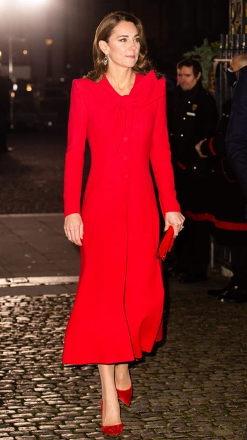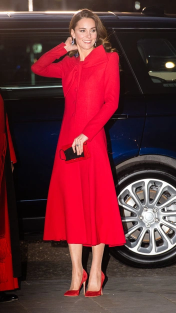Для мероприятия герцогиня выбрала алое платье-пальто с бантом на груди от одного из своих любимых дизайнеров Кэтрин Уокер и туфли-лодочки в тон от Gianvito Rossi.