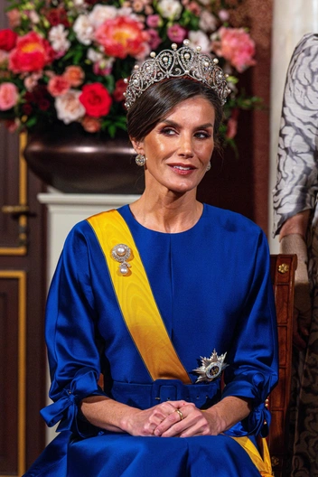 Остальная часть вечера прошла без нареканий — дамы королевских семей показали лучшие наряды и тиары из своих коллекций. Так, королева Летиция прибыла в сапфировом шелковом платье от испанского Дома The 2nd Skin Co. Эксперты моды считают, что королева не случайно выбрала именно этот оттенок — так как это один из цветов флага Нидерландов. В качестве украшений королева предпочла тиару с узором из бриллиантов и жемчуга Cartier Diamond Loop, брошь с жемчугом и бриллиантами Joyas de Pasar и серьги с крупными бриллиантами королевы Виктории Евгении Баттенбергской (читайте также: Модный реверанс: принцессы и королевы в нарядах своих мам и свекровей).