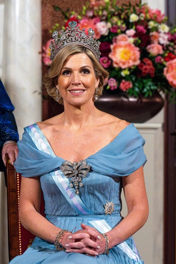 Хозяйка вечера королева Максима предпочла платье в спокойном голубом оттенке с открытыми плечами — чего не скажешь о ее поистине богатом ювелирном выборе. Монарх надела тиару Стюарта с крупными бриллиантами, брошь в виде банта и серьги с крупными камнями.