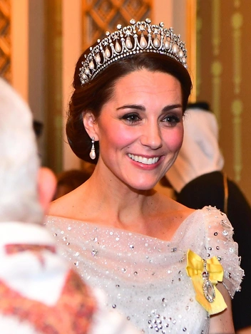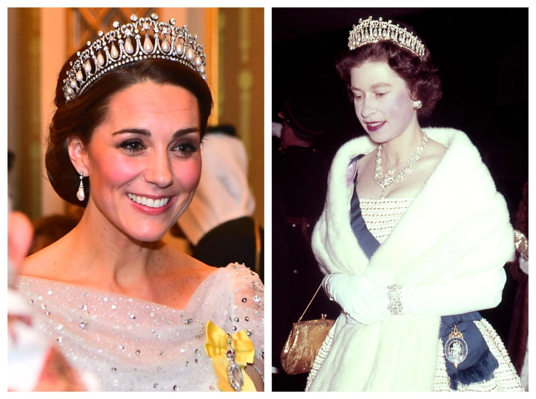 Но есть у королевы и герцогини и еще более явное ювелирное пересечение. На официальных мероприятиях и Елизавета, и Кейт носили тиару «Узелки любви» и жемчужные серьги из королевской сокровищницы.
