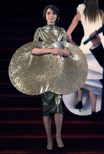 Темой (и дресс-кодом) вечера стал космос. Сексуальные платья женской половины в этот вечер сияли всеми оттенками серебра и стали, но самый оригинальный наряд был все-таки у хозяйки вечера: Водянова выбрала плащ со спущенными плечами от Simone Rocha, цвет которого она назвала «цветом раскаленной стратосферы».
