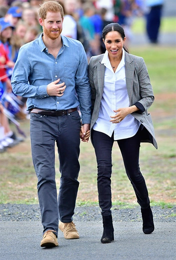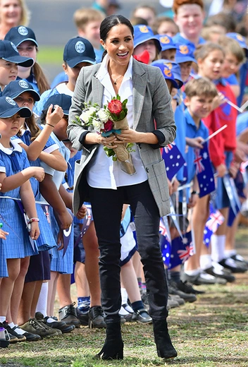 Расположенный на реке Маккуори, Даббо, тем не менее, считается очень засушливым городом. Правда, сегодня здесь обещают осадки и сильный ветер. Поэтому одеться Сассекским пришлось соответствующе. Меган предпочла черные джинсы, белую сорочку французской марки Maison Kitsune и серый пиджак Serena Williams свободного кроя (да, знаменитая теннисистка и подруга Меган еще и шьет одежду в свободное время). На ногах у герцогини - ботильоны американского бренда J.Crew на устойчивом небольшом каблуке (теперь поклонники могут не волноваться за будущую маму).