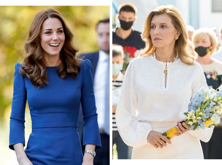 Две пары были запечатлены в тронном зале с традиционным дворцовым интерьером, включающим алые стены и ковры, золоченую отделку и мебель в классическом стиле. Роскошная обстановка отлично оттеняла наряды герцогини Кэтрин и Елены Зеленской. На 38-летней супруге принца Уильяма было нежное васильковое платье Emilia Wickstead со сдержанным V-образным вырезом и тканевым поясом с пряжкой. Ансамбль дополнили остроносые нюдовые лодочки и сдержанный комплект украшений с сапфирами.