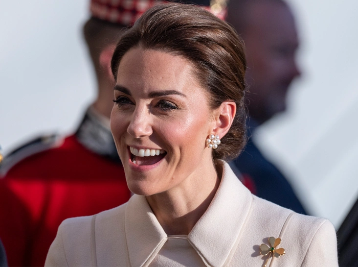 Ее Высочество появилась на церемониале в стильном кремовом пальто Catherine Walker & Co. с золотой брошью-трилистником (символ ирландской гвардии), а дополняли образ клатч Amberley цвета пудры от Mulberry и бежевые замшевые туфли. Герцогиня открыто улыбалась военным и выглядела прекрасно.