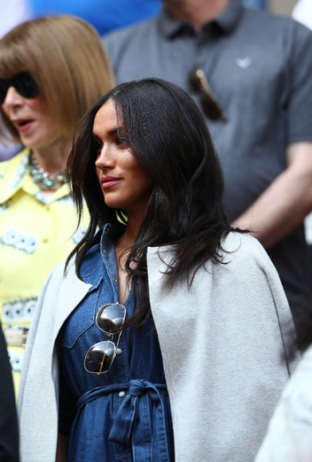На финале турнира, в котором Серена боролась за свой 24-й карьерный титул Большого шлема, Меган появилась в джинсовом платье от J.Crew и легком пальто оттенка серого жемчуга. Она тепло приветствовала супруга Серены Алексиса Оганяна и даже обняла его. Кстати, в ложе герцогиня расположилась вместе с Алексисом и другими членами семьи Уильямс.
