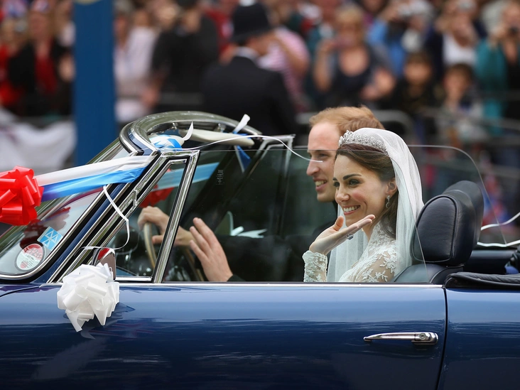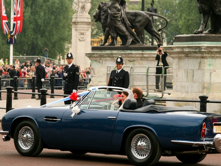 После приема Уильям и Кэтрин покинули Букингемский дворец на кабриолете Aston Martin Volante. Первоначально британский автомобиль принадлежал принцу Чарльзу. Машину украсили красными, белыми и синими лентами, бантами, и шариками. Забавный номерной знак «JU5T WED» сообщал о статусе новобрачных. Кембриджские сияли, проезжая через ворота королевского дворца и направляясь в Кларенс-Хаус, где у четы была временная лондонская квартира.