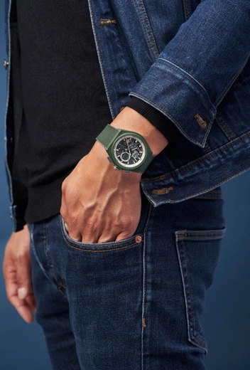 Сквозь скелетонизированный циферблат с серебристыми и черными матовыми счетчиками можно увидеть непревзойденный по своим характеристикам высокочастотный хронограф с двумя регуляторами хода, оснащенный основной платиной в цвете хаки и выполненным в форме звезды ротором. Дизайн завершает серый каучуковый ремень со вставкой с имитацией каучука Cordura зеленого цвета.