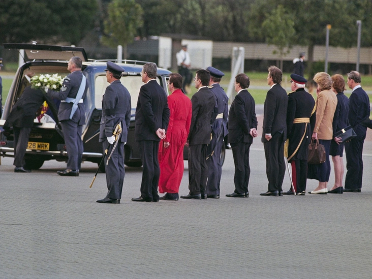 Пробыв недолгое время в больнице, Чарльза и сестры Дианы забрали гроб с ее телом. По просьбе Его Высочества он был задрапирован королевским штандартом. В аэропорту Парижа его погрузили на королевский самолет, и всего через 16 часов после гибели Уэльской самолет с ее телом приземлился на аэродроме RAF Northolt неподалеку от Лондона. Сначала гроб транспортировали в частный морг, потом в Сент-Джеймсский дворец, а затем в Кенсингтонский дворец.