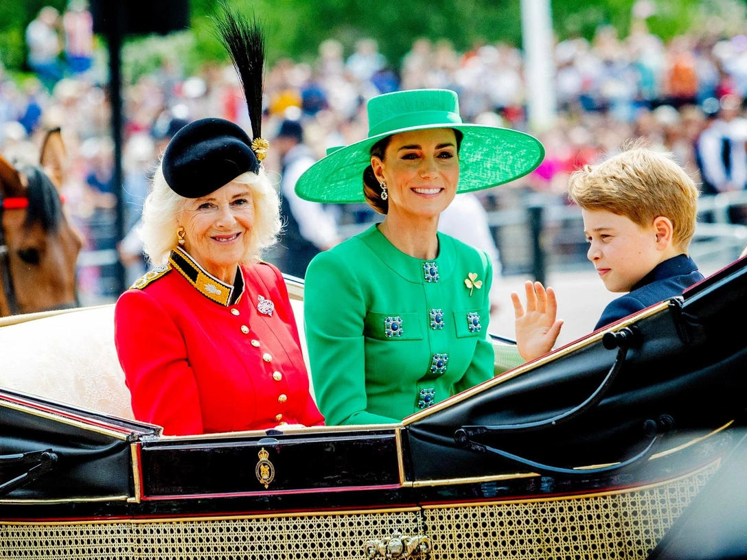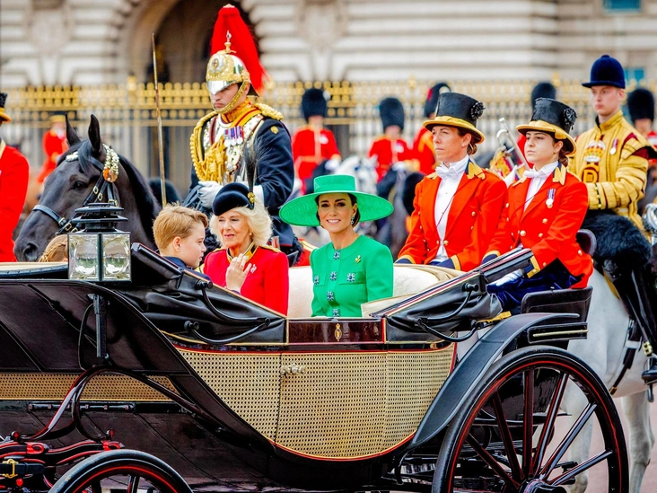 На Trooping the Color Кэтрин прибыла в карете вместе с королевой Камиллой и младшими Уэльскими. Каждый год с тех пор, как она присоединилась к королевской семье, супруга принца Уильяма участвует в параде в честь дня рождения суверена, подъезжая к Букингемскому дворцу в карете и затем появляясь на балконе вместе с другими Виндзорами.