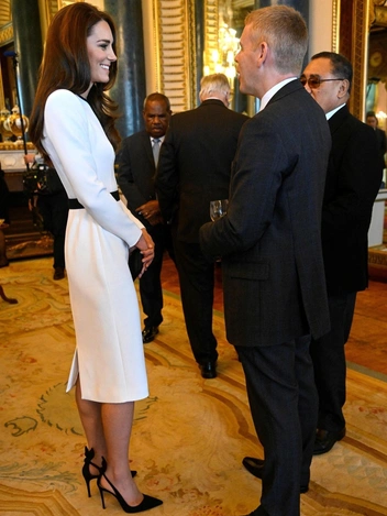 На коронацию маркиза прибыла в платье из кремово-черного крепа «в стиле Кейт Миддлтон», как выразились репортеры. Эффектная модель длины миди с черным бантом на шее и лентами в тон на рукавах гармонировала с черными остроносыми туфлями 105 Aquazzura стоимостью 645 фунтов стерлингов и черным ободком с вуалью. Хотя принцесса Уэльская вряд ли выбрала бы обувь с открытой пяткой на коронацию (хотя ее видели в точно таких же туфлях на официальном мероприятии в соседстве с платьем Jenny Packham) и вряд ли предпочла бы черный ободок полноценной шляпе, в целом образ ее предполагаемой соперницы очень похож на то, что можно найти в ее собственном гардеробе.