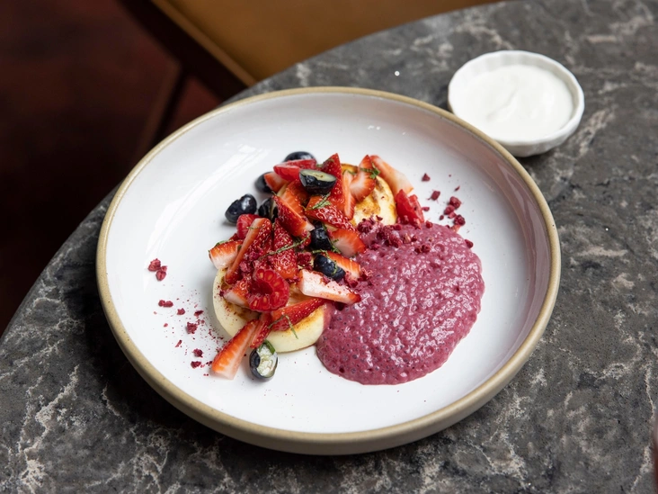 Меню, созданное шеф-поваром Дмитрием Погореловым, включает в себя семь разнообразных блюд, начиная от круассана с лососем и икрой и заканчивая сырниками с ягодным рагу, а авторские коктейли от Даниила Файнберга (Espresso tonic, Mimosa, Bloody Mary) сделают первый прием пищи по-настоящему особенным.