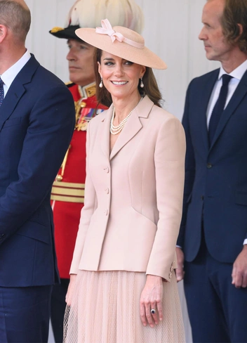 Приталенный бежевый жакет Bar королевская особа сочетала с юбкой-пачкой, туфлями в тон и шляпкой от Джесс Коллетт, украшенной пыльно-розовым бантом. К своему наряду Кейт также добавила особые украшения: жемчужное колье, в прошлом принадлежавшее Елизавете II, и серьги-капли, которые когда-то носила принцесса Диана.