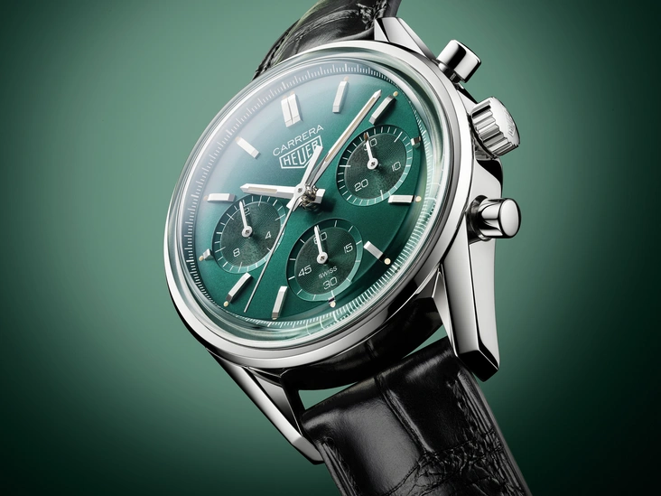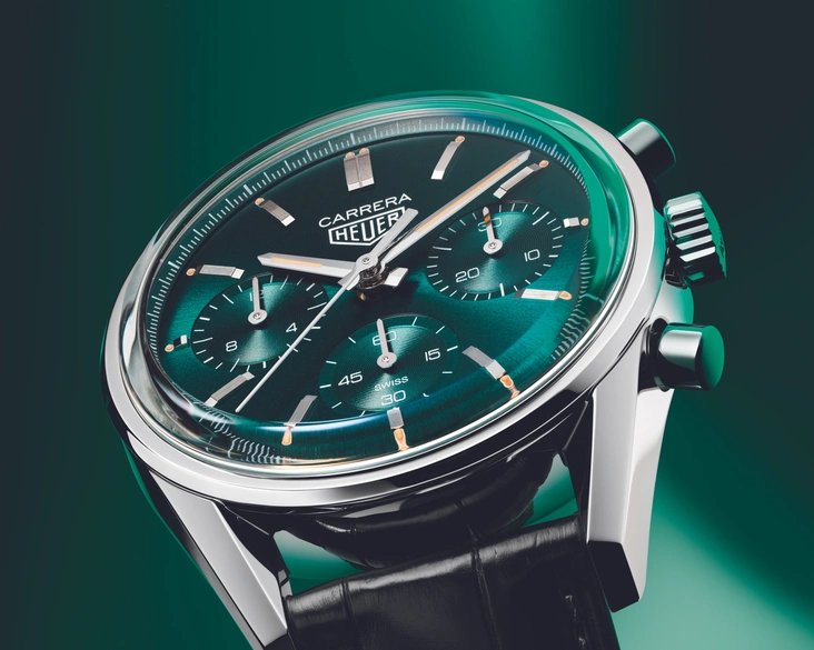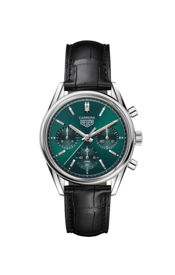 Хронограф TAG Heuer Carrera Green Limited Edition на самом деле имеет много общего с Heuer Carrera ref. 2447. Фирменные ушки, стильный корпус, полированные кнопки и циферблат — все это удивительным образом напоминает прославленного предшественника, но отдельные детали и более широкий диаметр — увеличенный с 36 до 39 мм — придают модели современный вид. Циферблат выполнен в сдержанном, утонченном стиле с тремя дополнительными циферблатами: минутным счетчиком в положении «3 часа», часовым счетчиком в положении «9 часов» и постоянным счетчиком секунд в положении «6 часов». Часовая и минутная стрелки граненые и покрыты Super-LumiNova® для оптимальной читаемости. За выпуклым сапфировым стеклом в ретро-стиле, также вдохновленным оригинальной моделью Heuer Carrera, на циферблате размещены логотип Heuer и название коллекции Carrera.