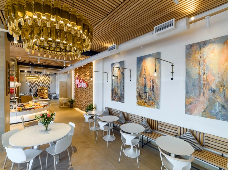 Здесь нет суеты, приветливый персонал, тихо и спокойно. Основатели кафе — Павел Мокрушин и Юлия Артемьева — создавали дизайн помещения, ориентируясь в первую очередь на то, чтобы гости чувствовали себя уютно. Несмотря на обилие белого цвета в интерьере, широкие окна и высокие потолки, не возникает ощущения пустоты — слишком большого или напротив — сжатого пространства. Цветовая гамма подобрана так, чтобы успокоить уставший от столичных скоростей глаз. Среди акцентов – теплый светло-серый, нежно-розовый и сиреневый цвета. С ними хорошо сочетаются яркие блюда на витрине.