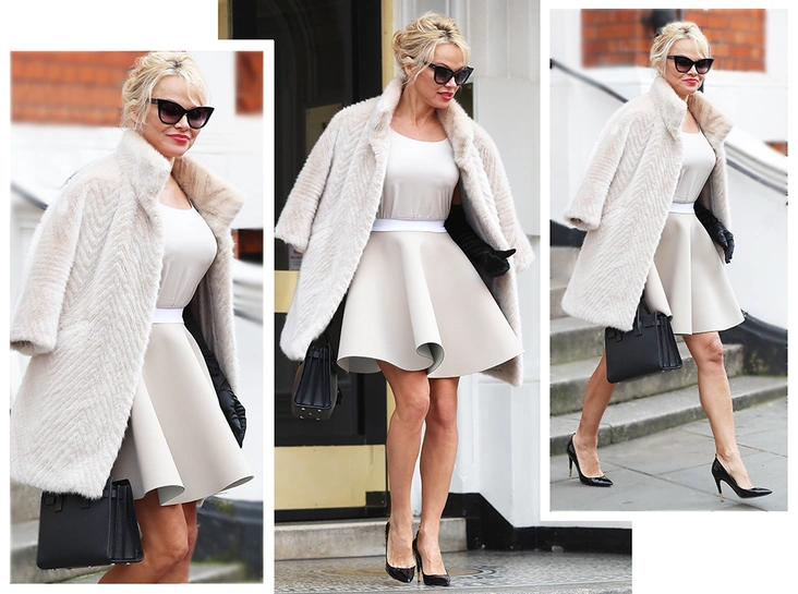 Образ Андерсон дополнила легким пальто оттенка светлого капучино с оторочкой искусственным мехом, черными с золотом туфлями на шпильке и шелковыми перчатками. Собранные на затылке волосы плюс алая помада – перед нами дама из высшего общества. И кто сказал, что хорошему вкусу нельзя научиться? Памела сломает любой такой стереотип.
