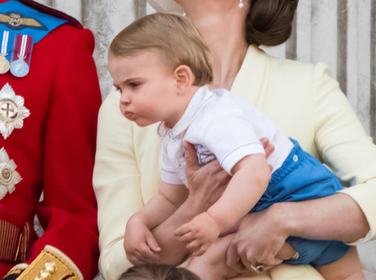 Будучи на руках у отца принца Уильяма, мальчик начал сосать свой большой палец — по-видимому, чтобы обрести привычное чувство комфорта. В это время члены семьи Виндзор на балконе смотрели в небо, в ожидании полета «Красных стрел» (пилотажная группа Королевских ВВС), но принц Уильям заметил, что большой палец принца Луи оказался у мальчика во рту и попытался аккуратно убрать ручку ребенка.