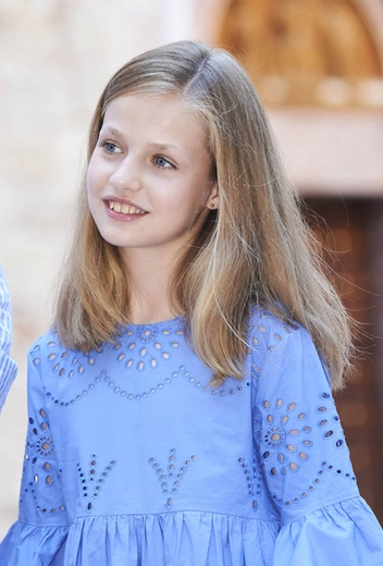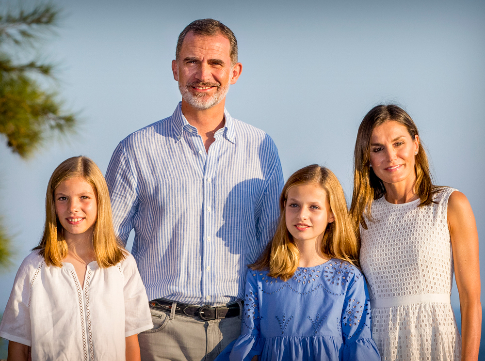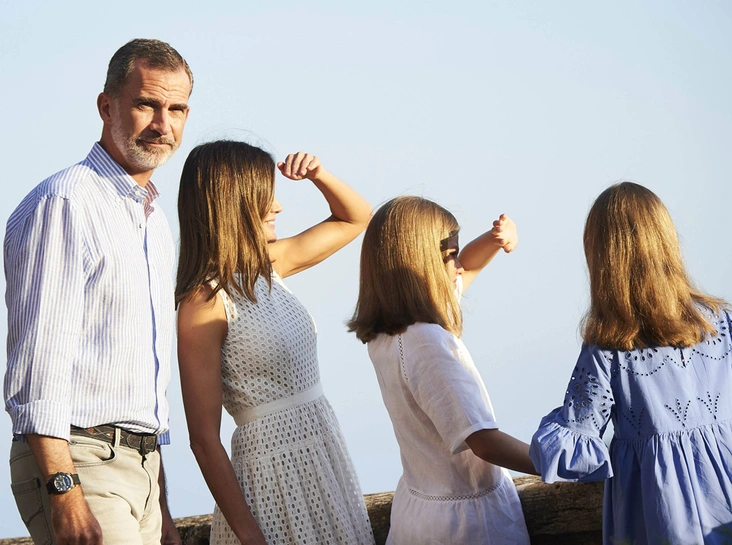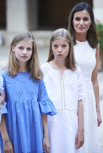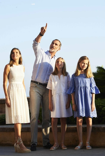 На снимках испанских монархов заметно, как довольно изящно скоординирована цветовая гамма членов семьи: Его Величество позирует в легкой рубашке в голубую полоску, наследница трона Леонор в голубом платье Zara, София в белом платье с ажурными вставками от Massimo Dutti и сама королева Летиция в платье из хлопка от Hugo Boss. Причем дизайнерский наряд из коллекции Dafalia дополнен летними туфлями на платформе от демократичного испанского бренда Mint & Rose (стоимость пары — $100).