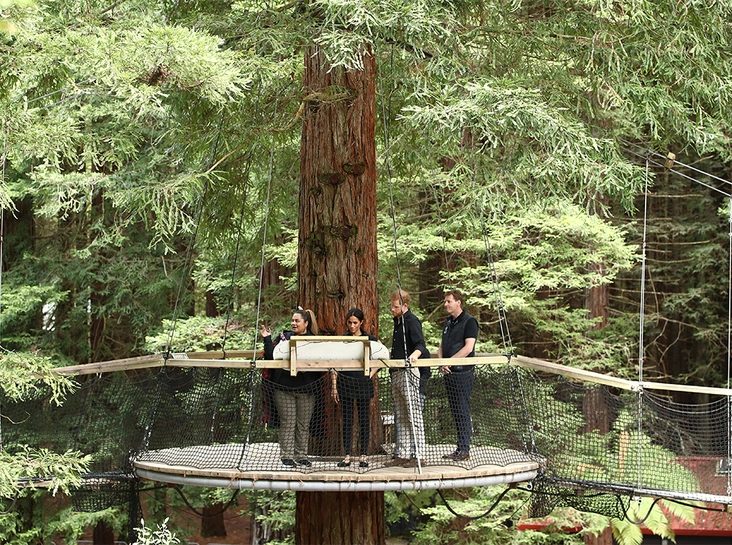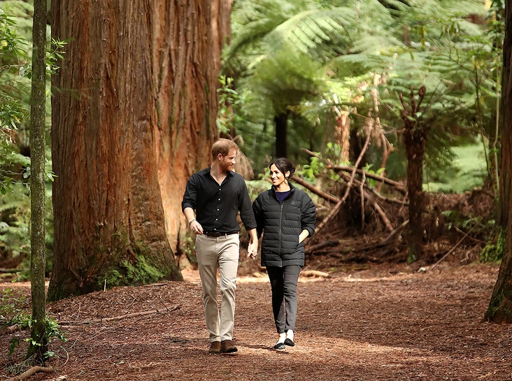 Во второй половине дня Сассекским представилась возможность почувствовать себя эльфами. Пара прибыла в парк Redwoods Treewalk, расположенный в Роторуа. Парк знаменит на весь мир своими висячими мостами, протянутыми между высоченными деревьями, средний возраст которых – 117 лет. Общая протяженность мостов – 700 метров. Прогулки по мостам особенно популярны у туристов в темное время суток, поскольку здесь повсюду зажигаются фонарики и все вокруг приобретает совершенно сказочный вид.