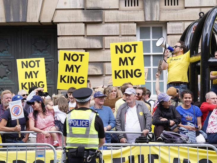 Двери бордового автомобиля Rolls-Royce открылись, и Карл III вместе с Камиллой направились в собор Святого Джайлса под крики протестующих: «Не мой король, не мой король!» Стоит отметить, что в отличие от официальной коронации, в Эдинбурге демонстрации не подавляли, а лозунги на плакатах не прикрывали щитами, дав возможность горожанам высказаться.