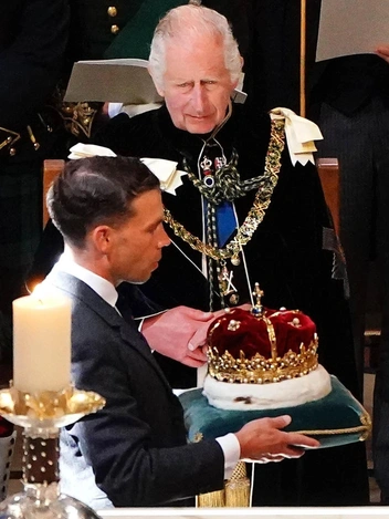 До приезда монархов в собор доставили королевские регалии: скипетр, корону, государственный меч и Ордена Шотландии. Королю дали обещание быть верными, а тот, в свою очередь, обязался соблюдать и уважать местные законы. Тем не менее, незадолго до коронации, первый министр Шотландии и лидер национальной партии Хамза Юсаф поддержал интересы государства обособиться от Соединенного королевства. Однако на данный момент доверие партии пошатнулось: ее обвиняют в воровстве, а потому процесс возможного отделения приостановлен.